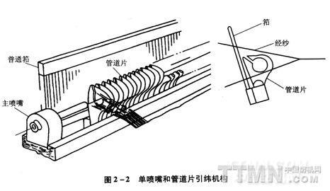 為了改變上述的氣流狀態,研究和發展了管道噴氣引緯。管道片有效地減少了氣流的擴散,提高了梭道出口側的氣流速度,為順利引緯提供了有利的條件。管道片引緯顯著地提高了布面質量,并使引緯有效長度達到1m以上,引緯需要的氣壓降低,動力消耗亦減少。因此管道片引緯的應用,使噴氣織機可以用來裝備生產車間,成為最早商品化的噴氣織機(圖2—2)。