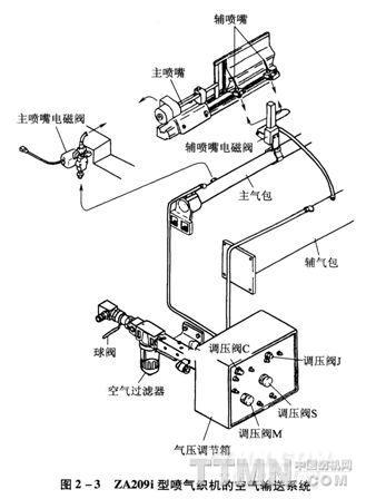 噴氣織機的空氣輸送系統是由空氣壓縮機出來的壓縮空氣,經過配管到達織機上的空氣過濾器,過濾后的空氣經過氣壓調節箱內的調壓閥調節壓力后,分送到噴射裝置的各執行器件。圖2—3為ZA209i型噴氣織機的空氣輸送系統。