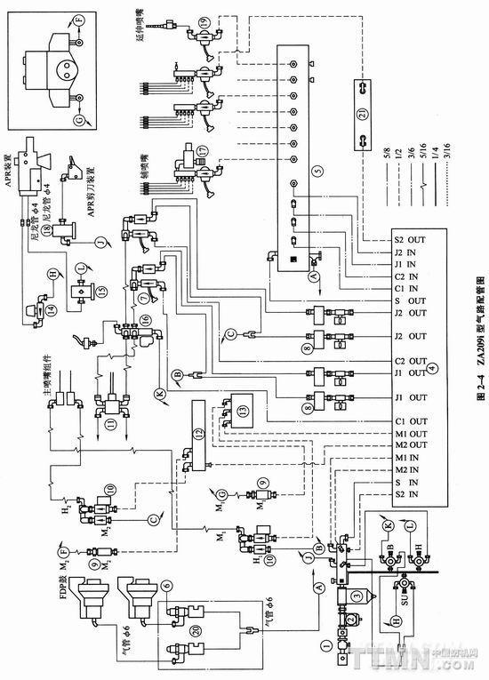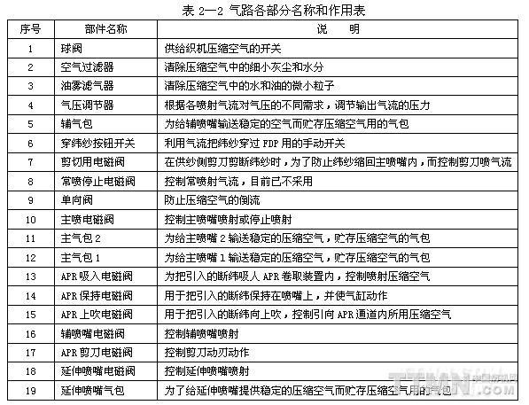 壓縮空氣輸送進織機,先經過濾器,濾除雜質,然后進氣壓調節箱,分路調壓后,輸至主氣包和輔氣包中,再經氣路的開關電磁閥輸至主噴嘴、輔噴嘴、剪切噴、延伸噴和緯紗處理系統的上吹、吸收和保持裝置。常噴和貯緯器所需的壓縮空氣直接由輔氣包經節流閥供給,不需要電磁閥控制。氣包除具有儲氣功能外,還起穩壓作用。主氣包用來儲存主噴嘴用的壓縮空氣。在多色時,特別是緯紗差異較大時,每個主噴嘴對應一個主氣包。輔氣包主要用來儲存輔噴嘴用壓縮空氣。輔噴嘴耗氣量占全部耗氣量的80%左右(參見氣路配管見圖2—4,各部分名稱和作用見表2—2)。