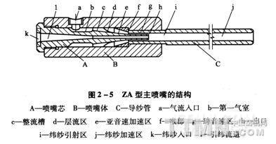噴氣織機主噴嘴由三部分組成,即噴嘴體B、噴嘴芯A、導紗管c。噴嘴內氣流通道則由氣流加速區、緯紗引射區和緯紗加速區組成。由儲緯器引來的緯紗從人口k進入引緯流道l。由主氣包來的高壓氣流從氣流入口a進入噴嘴。