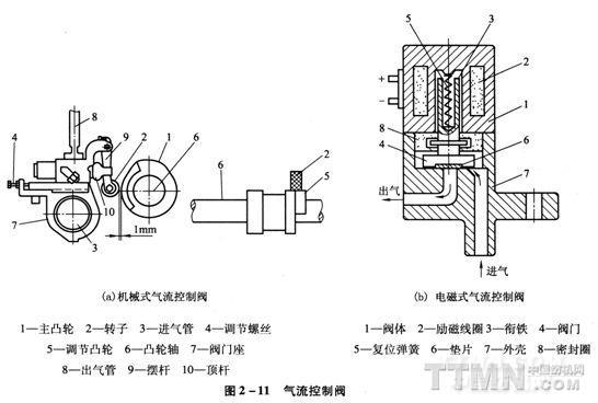(2)電磁式氣流控制閥[圖2一11(b)]:由于電磁式氣流控制閥具有受控性較好,動作靈敏,調節簡單,使用壽命長等優點,已在噴氣織機上得到廣泛應用。