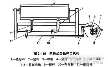 (1)消極式凸輪開口機構:由于凸輪輪廓面形狀可以按照開口工藝進行設計,所以凸輪開口機構的運動性質可以彌補連桿開口機構運動性質難以改變的不足,拓展了織物的適應性。它不僅能織制平紋、斜紋和緞紋,而且可以織造燈芯絨及某些復合組織的織物。因此是用戶廣泛采用的開口型式(圖2—15)。