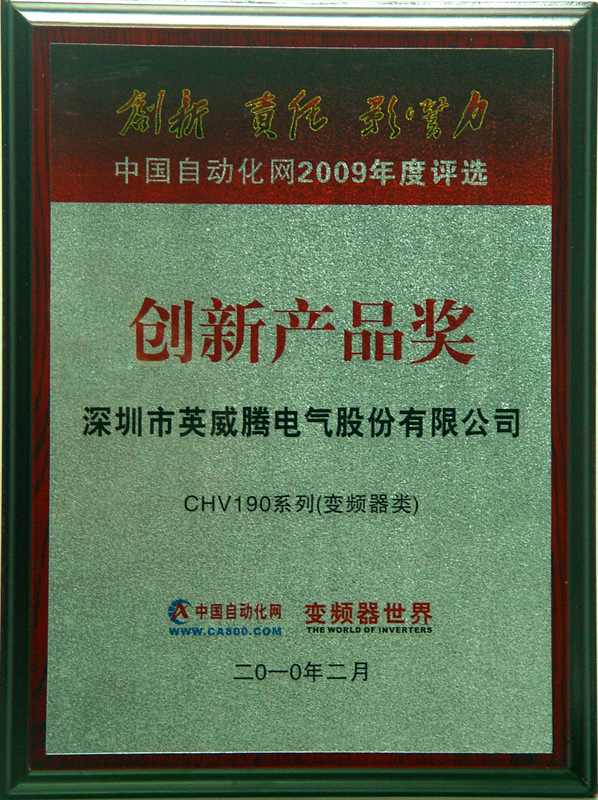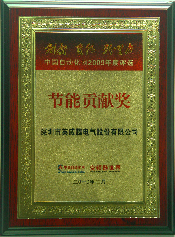2010年3月,在中國自動(dòng)化網(wǎng)2009年度評(píng)選中,英威騰獲得“創(chuàng)新產(chǎn)品獎(jiǎng)”和“節(jié)能貢獻(xiàn)獎(jiǎng)”。
