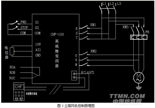 2)在變頻器的硬件上只要通過一條485通訊外接鍵盤,就可制作成兩路面板控制;鍵盤和主板之間可用1200米以內(nèi)的屏蔽線聯(lián)結(jié),以滿足用戶的要求。保留原風(fēng)機(jī)窯面和值班室兩處的緊急停車按鈕,在空開和變頻器之間的主電路中,增設(shè)交流按觸器。用鋼材把原放風(fēng)閥封牢。變頻改造后要依次合理調(diào)節(jié)每一個(gè)窯爐風(fēng)腰的開度。