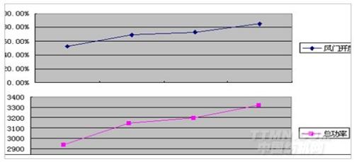 通過對上述數(shù)據(jù)中總功率和擋板平均開度之間關(guān)系的變化趨勢分析,可以看出風(fēng)門擋板開度和總功率之間略呈線形關(guān)系。如下圖所示: