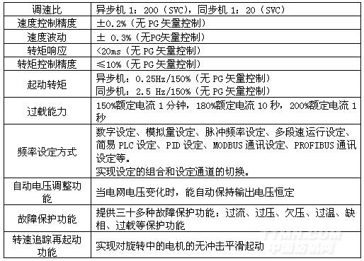 Goodrive300變頻器是深圳市英威騰電氣股份有限公司新開發的一款高性能開環矢量變頻器,具有V/F和無PG矢量兩種控制模式,其中在突加減載荷的情況下,速度波動非常輕微;可支持永磁同步電機、變頻器電機、直驅電機等,可以為用戶減少庫存,不再需要為不同的電機備用不同變頻器的庫存;具有準確的電機參數自學習功能,支持旋轉自學習與靜態自學習,其中靜態自學習可以在電機無法脫開負載的場合準確的學習電機的參數;具有先進的全程三相調制方式,使電機運行更平穩,噪音更小;其他的特性參數、功能如下表所示: