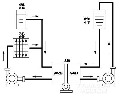 該部分由冷卻泵、冷卻水管道、冷卻水塔及冷凝器等組成。冷凍水循環(huán)系統(tǒng)進行室內熱交換的同時,必將帶走室內大量的熱能。該熱能通過主機內的冷媒傳遞給冷卻水,使冷卻水溫度升高。冷卻泵將升溫后的冷卻水壓入冷卻水塔(出水),使之與大氣進行熱交換,降低溫度后再送回主機冷凝器(回水)。