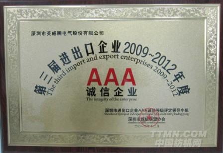 2012年12月,英威騰獲評為“第三屆進出口AAA誠信企業(yè)”,與華為、中興、創(chuàng)維等企業(yè)同時入選。據(jù)悉,獲認定的企業(yè)將享受到海關(guān)、檢驗檢疫等政府部門提供的多項優(yōu)惠待遇,及享受海關(guān)綠色通關(guān)便利。