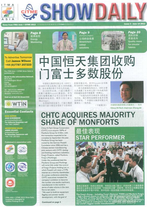 另其它重要消息, 由中國恒天集團董事長張杰先生宣布,中國恒天集團有限公司收購門富士100% 的股份, 該交易預計將于今年九月完成并表示中國恒天以成為具有全球競爭力的企業為目標, 制造旗艦設備并引領紡織研發。