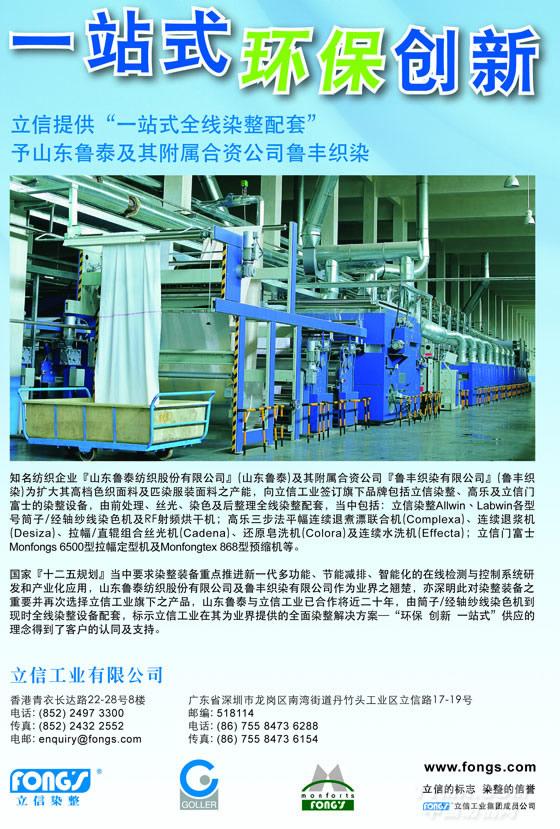 知名紡織企業(yè)『山東魯泰紡織股份有限公司』(山東魯泰)及其附屬合資公司『魯豐織染有限公司』(魯豐織染)為擴大其高檔色織面料及匹染服裝面料之產(chǎn)能,向立信工業(yè)簽訂旗下品牌包括立信染整、高樂及立信門富士的染整設備,由前處理、絲光、染色及后整理全線染整配套,當中包括:立信染整Allwin、Labwin各型號筒子/經(jīng)軸紗線染色機及RF射頻烘干機;高樂三步法平幅連續(xù)退煮漂聯(lián)合機 (Complexa)、連續(xù)退漿機(Desiza)、拉幅/直輥組合絲光機 (Cadena)、還原皂洗機 (Colora)及連續(xù)水洗機 (Effecta);立信門富士Monfongs 6500型拉幅定型機及Monfongtex 868型預縮機等。