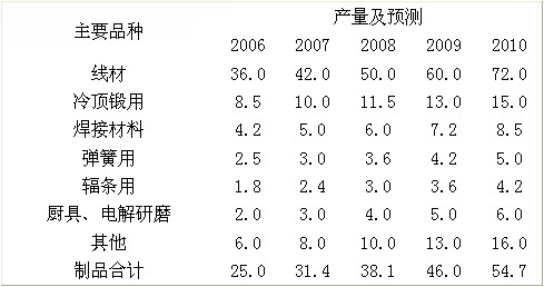 我國不銹鋼絲品種按用途可分20多種,主要有冷頂鍛、彈簧、焊接、易切削、金屬網、醫療、纖維、繩用、電解研磨、廚具、輻條用等。冷頂鍛用量最大,約占25%~30%;其次為焊接用,約占15%,彈簧用約占8%,民用廚具、輻條、電解研磨等是發展較快的品種,占10%~15%。預計到2010年,我國鋼線材產量將達到72萬t,線材制品將達55萬t,具體情況如表所示。