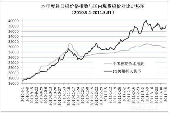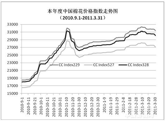 3月國內棉花現貨市場先漲后跌。上旬受國際價格、紡織企業補庫、棉商惜售等因素影響,持續小幅上漲;中旬后,日本地震引發大宗商品市場全面回落,國內外期貨行情大幅波動回落,對現貨市場形成壓力,加之紡織企業經營狀況不佳,原料采購更趨謹慎,國內棉花價格不斷下滑,月末已低于月初水平,但月均價環比仍上漲近千元。其中CCIndex328級月均價30733元/噸,較2月上漲938元/噸,漲幅3.1%,較去年同期上漲15172元/噸,漲幅98%;CCIndex229級月均價32630元/噸,環比上漲1211元,同比上漲16467元。CCIndex527級均價為27771元/噸,環比上漲605元,同比上漲13303元。