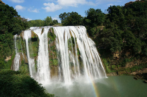 行程的最后一天我們來到了中國第一大瀑布——黃果樹大瀑布,這也是我們此次旅行的精華所在!對于長居北方的人來說,大家見到瀑布的機會并不多,尤其是聞名遐邇的黃果樹瀑布,那更是讓人神往!大家懷著急迫的心情,沿人工臺階而下,路邊是長滿的青藤和黃果樹,隨著前方行人的一片片歡呼聲,黃果樹大瀑布頓時侵入眼簾,除了驚嘆大自然的鬼斧神工外,無法用其它詞語所形容。它是那么的真實,那么的美麗,尤其是依山的青翠,更增添了些許的秀美,少了幾許的粗獷,陽光下瀑布上掛著一條長長的彩虹,隨著時間的推移,彩虹也逐步攀高變大……此時大家只有感慨形容美麗的詞語太匱乏了!