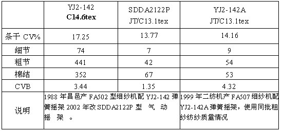 (3)、新疆五家渠聯(lián)營棉紡織廠對其72臺FA503(配YJ2-142搖架)進行了改造,其中36臺改造為SDDA2122P氣動"V"型牽伸搖架,36臺改為德國緒森公司HP-310型板簧搖架。紡紗質(zhì)量狀況如下: