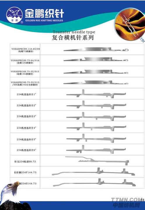 復(fù)合橫機(jī)針則包括VOSASPEC89.118-85/09(島精7G移圈針)、VOSASPEC89.75-64/016(島精12G移圈針)、VOSASPEC89.75-55/015(島精14G移圈針)、VOSASPEC89.75-55/015/SH(島精14G小勾移圈針)、234機(jī)型選針片1’至6’、針叉234機(jī)型88.73、長(zhǎng)針腳234F144.73及長(zhǎng)針腳234S144.73共13種復(fù)合橫機(jī)針。