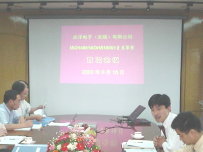 2003年9月17日光洋電子(無錫)有限公司的ISO14001、OHSAS18001管理體系一次通過了法國BVQI國際認證公司認證。