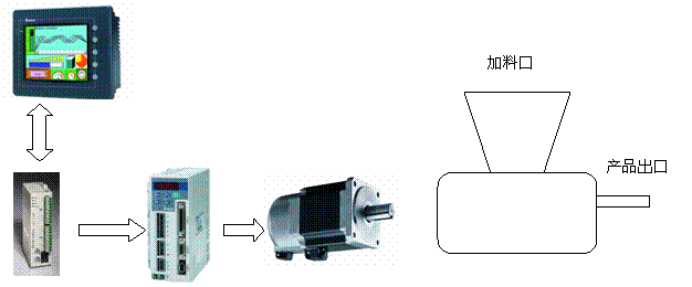 項目屬于機械設備的系統,要求精度較高,工藝過程相對復雜。主要要求如下:通過設定不同檔次的腸料,可以加工3種規格的產品;要求實際偏差不得超過±5g;要求可設定手動和自動連續運行;要求伺服的速度能夠連續調整;偏差微調功能,并且顯示微調值;