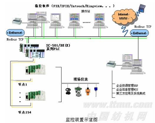 遠程監控硬件主要包括上位機桌面電腦、SC-501/DE(E) 系列PLC、臺達10SS(v5.9及以上)小型PLC及模擬量模塊。SC-501/DE PLC是盟立公司最新推出的新版本控制器,主機自帶雙以太網口和COM1/2兩個通訊口,其中以太網口作為主站支持通過MODBUS TCP協議和下位機通訊,COM2口作為主站支持通過MODBUS協議/自由口通訊和下位機通訊。這樣就可以輕松實現和同樣支持MODBUS協議的臺達PLC的多平臺接入,監控裝置系統示意參見下圖。