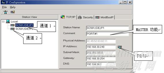 (3)TCP/IP 設置。如果能正常連接到SC-501/DE, 就可以修改 TCP/IP 參數了。 完成輸入后, 使用 “PING” 指令可以測試 TCP/IP連接。 【Station Name】 和【Comment”】是可選項。 如果沒有定義 【Station Name】, 名字由IPConfig自動分配。