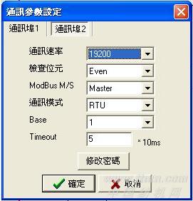 STEP 4: 設置COM2口通訊屬性。設置波特率、奇偶校驗、主從設置、ASCII/RTU、站號及Timeout時間。見下圖: