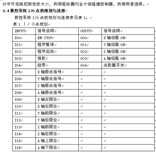 數控系統控制的點膠機設備共有四個軸,使用四臺伺服控制器和伺服電機,X軸一臺、Y軸兩臺、Z軸一臺;輸入信號有急停按鈕、手動自動轉換按鈕、手動點膠按鈕、暫停按鈕、回零按鈕、左右限位輸入信號及伺服報警信號等共計21個輸入信號;控制流程是使用數控系統控制四個伺服控制器及伺服電機、四個點膠器的開關信號,自動運行時Y軸控制的兩個平臺交替工作,X軸和兩個Y軸需要走直線插補或圓弧插補,Z軸需要走不同高度的點膠面,更換產品比較頻繁,更換產品后需手動調整開膠點,然后在進行單步動作或自動運行;功能與特點:1.所有軸上均采用了滾珠絲杠和伺服電機,可以確保用戶能夠流暢、精準、正確地點膠;2.點膠準確、均勻;3.注膠量、點膠速度可任意調節;4.LED中文菜單顯示;5.輕觸式按鍵操作;6.控制簡單、方便、直觀。