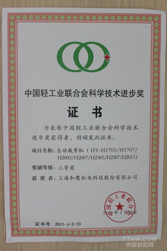 此項(xiàng)獎(jiǎng)項(xiàng)是中國(guó)輕工聯(lián)合會(huì)對(duì)和鷹科技在2011年度在科技方面取得的進(jìn)步肯定。作為專業(yè)從事于軟性材料裁剪領(lǐng)域的數(shù)控裁剪設(shè)備生產(chǎn)經(jīng)營(yíng)商,和鷹科技在短短幾年的時(shí)間內(nèi)迅速發(fā)展成為了全球最具影響力的數(shù)控裁剪設(shè)備品牌企業(yè)。公司打破了國(guó)外品牌數(shù)十年來(lái)在中國(guó)的市場(chǎng)壟斷,填補(bǔ)了國(guó)內(nèi)在該領(lǐng)域的技術(shù)空白。