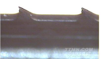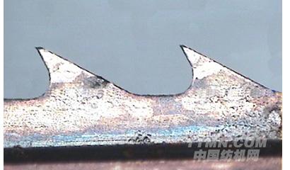 3、如圖所示,是典型的齒尖缺損,是在電鏡放大180倍的照片,齒尖凹凸不平、棱邊不整齊平滑、齒尖毛刺,普通低倍放大鏡是無法檢出的,而棉紡廠手感還誤以為鋒利度極好。這種齒形,凸點先受磨擦,鋒利度很快下降,極不耐磨。