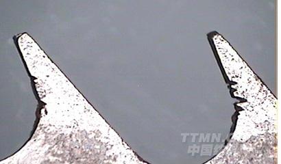 2、如圖所示,是典型的大小齒,齒頂長超差。是由于架模間隙偏大,及模具磨損超限造成齒頂長超差,此類齒形一般總高變化不大,但對鋒利度有很大影響,減弱了穿刺纖維