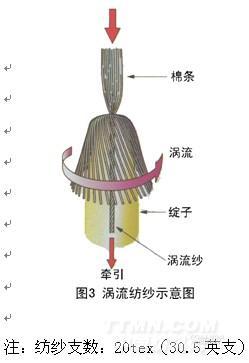 但如果生產純棉渦流紗時,產品質量由于棉纖維整齊度差使渦流紗在高速紡紗時紗線強力因紡紗速度的提高而顯著的降低,條干變差,毛羽增加,從而增加了織機的停臺。這是渦流紡生產純棉紗今后要進一步研究解絕的問題,(見圖3)