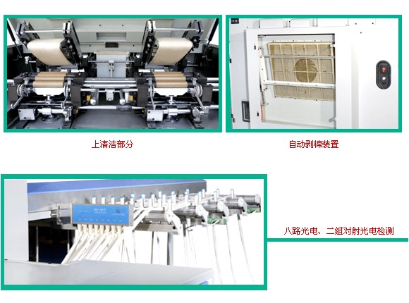- 具備自動剝棉、自動補換筒及限位、積極斷條裝置;自動生頭、自動潤滑等功能可供選擇使用