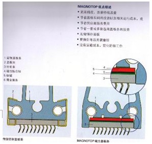 1.5.1、TC5-1梳棉機應用了磁力蓋板系統(tǒng)MAGNOTOP,應用磁性粘合層等新材料及新技術使蓋板的制做及維修工作大大間化,即省工又省時,也不再需要許多空間面積,使運行費用大為降低。磁力蓋板技術MAGNOTOP的應用還可隨時進行新蓋板的更換試驗,蓋板針布裝拆很方便;應用磁力蓋板的緊固系統(tǒng)NAGNOTOPDE 可