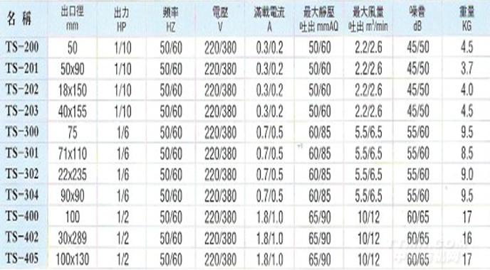 TS201-405鼓風機特性說明: 一般用于塑膠材料片材的擠出、吹塑等相關機械設備上的抽排風,采用鋁合金重力壓鑄外殼,配合離心葉輪及優化參數設計,使各風壓及風流量達到所配置的性能最優,以利使用壽命能完全配合所設計的8---10年! TS系列說明:名稱 出口徑 出力 頻率 電壓 滿載電流 最大靜壓 最大風量 噪音 重量