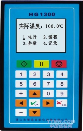 HG-1300染色機控制電腦選用液晶顯示屏幕。可先擇中文或英文顯示方式,采用友好的人機界面,操作簡便,讓你無需說明書也能根據界面完成大部分操作。屏幕顯示簡潔完善,一目了然。該電腦控溫效果理想,可廣泛適用于常溫染色機、高溫染色機、染紗機等控溫對象。