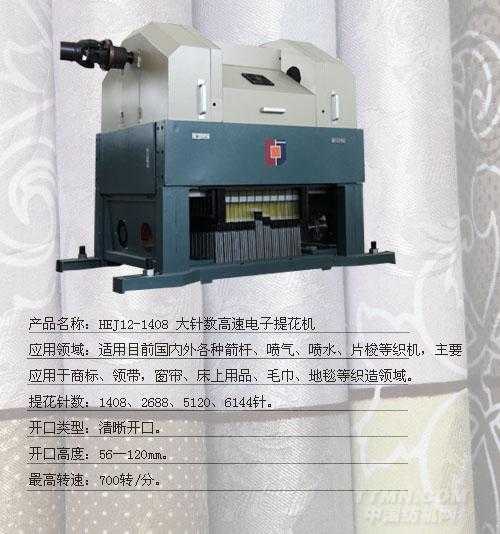1408針電子大提花機,整合了先進的設計理念,結構更優化,功能更強大。適用目前國內外各種箭桿、噴氣、噴水、片梭等織機,主要應用于商標、領帶,窗簾、床上用品、毛巾、地毯等織造領域。