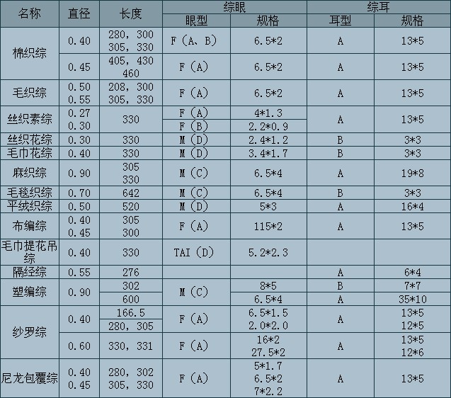 豐衣牌鋼絲綜規(guī)格、種類齊全,并可根據(jù)用戶要求制作各種特殊規(guī)格。