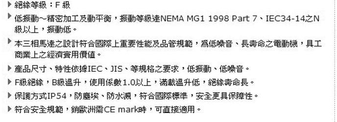 臺(tái)灣高崎立式高效率電機(jī) 產(chǎn)品系列:AEHL/AEUL系列(JIS/CNS系列) 馬力(HP): 1/4HP~100HP(0.18KW-75KW)極數(shù)( P ):2、4、6 電壓( v ):200~460 頻率(Hz): 50、60 框號(F#): 63~250 保護(hù)方式: IP54 絕緣等級: F 級 ●高效率~提升能源使用效率,比原標(biāo)準(zhǔn)系列損失降低10%~30%,運(yùn)轉(zhuǎn)越久,節(jié)省的電費(fèi)越多。 ●低振動(dòng)~精密加工及動(dòng)平衡,振動(dòng)等級達(dá)NEMA MG1 1998 Part 7、IEC34-14之N級以上,振動(dòng)低。 ●本三相馬達(dá)之設(shè)計(jì)符合國際上重要性能及品管規(guī)范,為低噪音、長壽命之電動(dòng)機(jī),具工、商業(yè)上之經(jīng)濟(jì)實(shí)用價(jià)值。 ●產(chǎn)品尺寸、特性依據(jù)IEC、JIS、等規(guī)格之要求,低振動(dòng)、低噪音。 ●F級絕緣,B級溫升,使用系數(shù)1.0以上,滿載溫升低,絕緣壽命長。 ●保護(hù)方式IP54,防塵埃、防水濺,符合國際標(biāo)準(zhǔn),安全更具保障性。 ●符合安全規(guī)范,銷歐洲需CE mark時(shí),可直接適用。 ●高效率馬達(dá)群組系列化,產(chǎn)品齊全符合各國際法規(guī),具跨市場之泛用性。