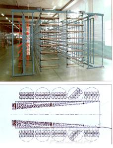 V型循環(huán)式筒子架主要和整經(jīng)短纖維的分批整經(jīng)機(jī)配套使用。主要優(yōu)點(diǎn)是架身短,架子與伸縮筘間無(wú)倒紗器,特別適用對(duì)摩擦敏感的短纖維,實(shí)現(xiàn)低張力水平高速運(yùn)行,有利于減少紗線的張力差異和整經(jīng)時(shí)候的斷頭率。交錯(cuò)的紗筒布置優(yōu)化了空間利用,V型內(nèi)側(cè)可存放預(yù)備筒子架,便于工人操作,換筒時(shí)間短,減少整經(jīng)時(shí)停車(chē)時(shí)間。該筒子架特別適應(yīng)高速整經(jīng)。