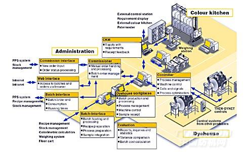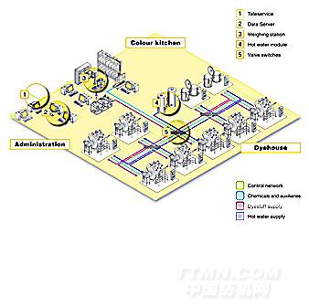 網絡的另一個功能是控制系統,透過染廠網絡使流程之間相互調節和發揮最佳效能。還可聯系訂單管理到機器的控制單元上,從而組成一個完整的染廠網絡。