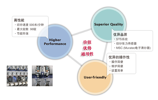 我們對這一答案總結為3個概念,即價值(Value)、優勢(Vantage)以及通用性(Versatility)。為了將概念反映到性能中,我們精挑細選出所需要的功能,然后著手第三代渦流紡紗機的開發。并且作為開發的成果,VORTEX Ⅲ 870實現了超越歷史的紗線品質、使用方便度以及性能。