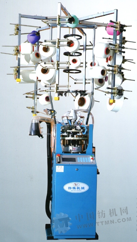 “偉煥”牌WH-12/E7型絲襪機是由電腦控制的具有四路編織系統的單針筒提花絲襪機,該機采用獨立抽風機或中央抽風系統進行織物牽拉,