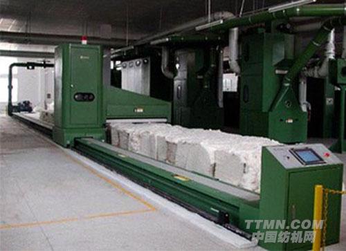 抓臂工作寬度1800-3000mm,機臺標準長度30米,單邊可排列60包。當選用大型A5030TYPE,機臺特殊總長60米。單邊可容納棉包200包,以生產線每小時1200kg,一組棉包可連續供應60小時。