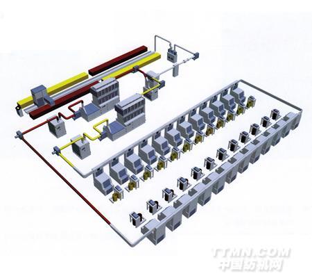 該機器配置的PLC智能系統一機兩線設備流程中的CPC預開棉機,可根據原棉的含雜質不同,設置兩組除雜工藝,與搖板閥同步變化,除雜效率更高,纖維損傷最小。一機兩線清花的兩條喂棉管道尾端可以閉環連接,(配16臺梳棉機以下)并加裝若干各插板閥,即可滿足兩條清花線不同產量的供應關系。