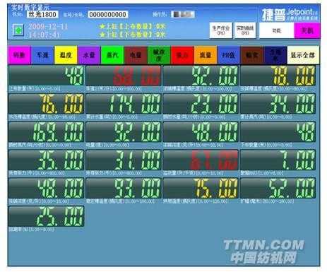 系統通過對生產工藝參數的在線采集和預警,確保標準工藝的執行,消除非正常次品和回修的產生,穩定產品品質;通過對機臺水、電、汽能耗數據的在線采集,可以準確核算布種單位能源消耗,有效控制能源成本;通過對車間布匹流轉數據的在線采集,可以實時追蹤生產的進度,確保按照生產計劃執行,有效減少丟車和撕布現象;在車間裝有大屏幕 LCD 看板系統,滾動顯示訂單生產進度等信息;通過對采集的生產歷史數據進行分析,還可以優化生產工藝,準確核算生產成本,為企業提供科學高效的決策依據,達到企業最優化管理。