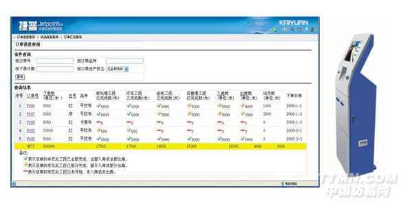 (2)客戶自助終端——在樣品陳列室或客戶接待室,設置客戶自助查詢終端;或者在企業網站上開設查詢頁面,客戶可以通過自助查詢終端或互聯網查詢自己訂單的實時生產進度、查看成品的驗布報告、查看歷史訂單等。