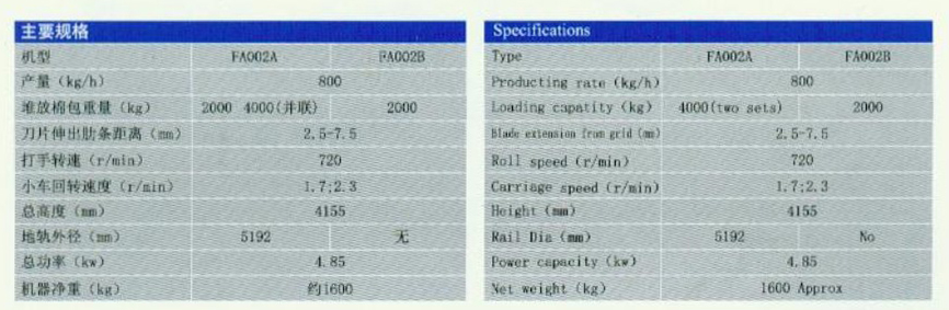 FA002A和FA002B均采用鋸齒刀片打手,自里外刀片由稀到密分為三組,使抓取的纖維束小而均勻,有利于后道工序開松、混合、除雜。