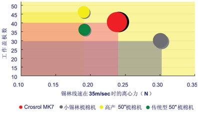 Crosrol MK7梳棉機實現了梳理面積、梳理速度、離心力的完美平衡 Crosrol MK7梳棉機獨特的設計理念,可以提供最大的梳理能力,并極大地優化了梳理面積,梳理速度及離心力之間的平衡關系。CrosrolMK7梳棉機獨特設計保證了機器運行的精確及穩定,確保了MK7具有完美的梳理能力; 只有Crosrol MK7梳棉機能夠帶給您: 最大的梳理速度:獨特的結構及40’錫林的穩定性,保證錫林線速度可達到每秒42.5米以上,遠遠高于其他類型梳棉機 最高的離心力:Crosrol的40’錫林以及極高的表面速度,提供了強大的離心力