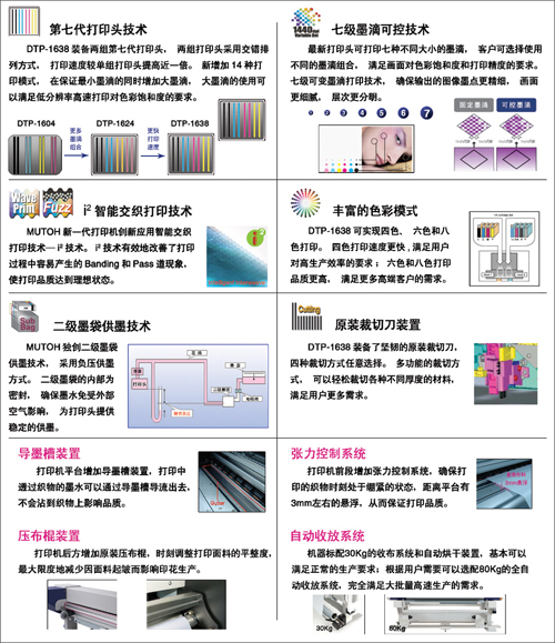 DTP-1638裝備兩組第七代打印頭,最大打印幅寬1,615mm,生產速度四色50平米/小時,六色、八色25平米/小時。