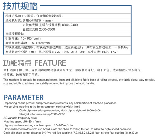 公司生產的ZXH918型節能高速絲光機,具有絲光檔次高,具有高速、高效、節能、環保,絲光鋇值高,門幅穩定等特點。目前暢銷市場,定型機也是我公司的龍頭產品,應用廣泛。且我公司營銷、售后服務遍布全國各地,已有大量印染廠家訂購,具有廣闊的市場前景。