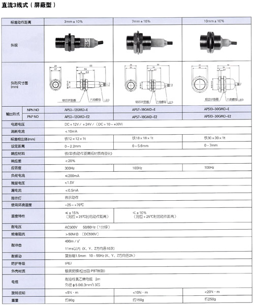 直流開關輸出、動作狀態可視型●優點寬范圍的動作距離在允許的范圍內可設定多種動作距離●動作狀態可觀察安裝時調整方便,在360℃的任意角度都可觀察動態