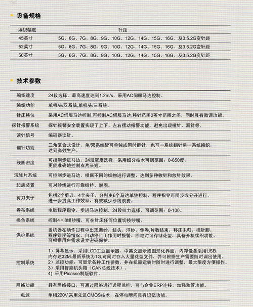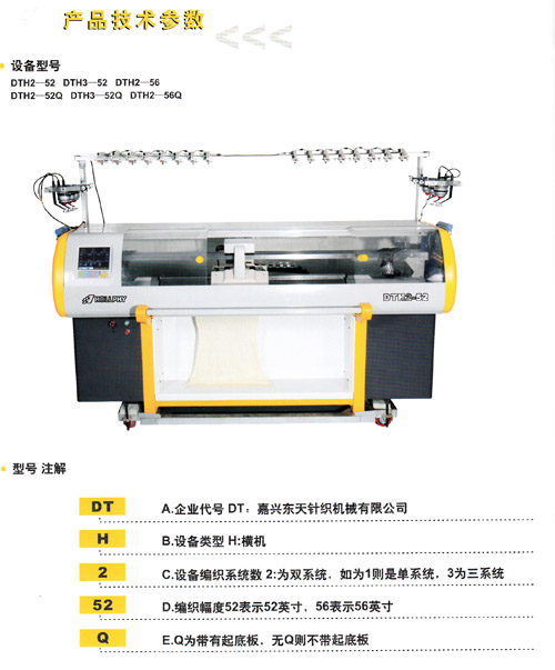 型號注解DTA:企業(yè)代號DT:嘉興東天針織機械有限公司HB:設備類型H:橫機2e:設備編織系統(tǒng)數(shù)2:為雙系統(tǒng),如為嚯則是單系統(tǒng),3為三系統(tǒng)52D:編織幅度52表示52英寸,56表示56英寸QE.Q為帶有起底板,無Q則不帶起底板
